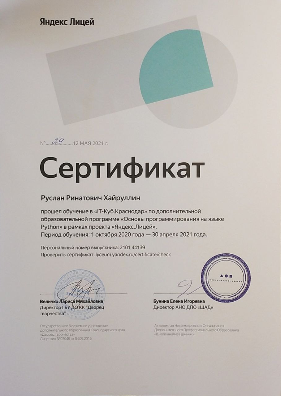 Explored desktop apps, web development, and game development. Earned two Yandex certificates in Python programming.